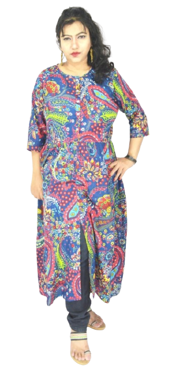 This long calf-length kurti boasts a universally flattering silhouette that drapes beautifully, offering a graceful and elegant look. The ¾ length sleeves strike a perfect balance between style and practicality, providing ample coverage while allowing for freedom of movement. Each kurti is a testament to fine stitching, showcasing meticulous attention to detail and robust construction that ensures longevity. Our expert tailoring guarantees a comfortable and flattering fit for various body types.
