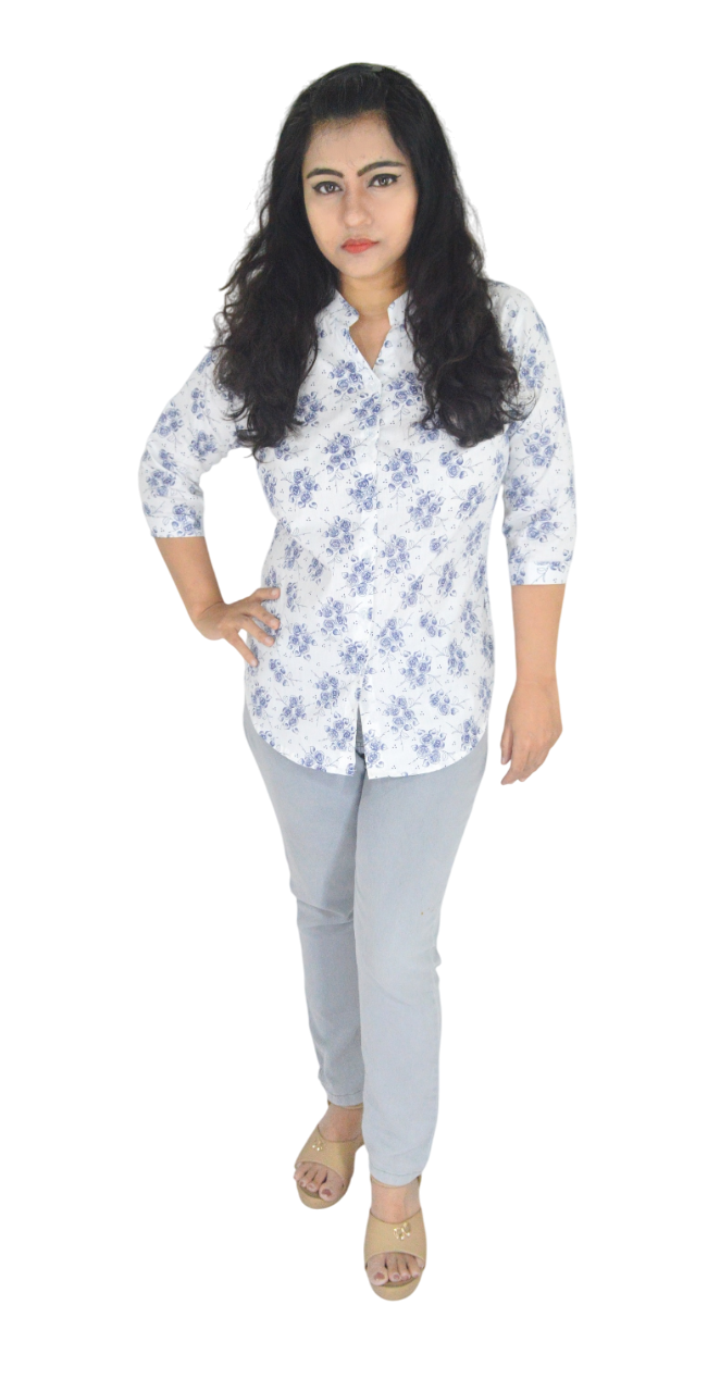 Elevate your wardrobe with this Printed Cotton White Base casual shirt crafted from 100% cotton. Featuring a mandarin collar, ¾ sleeves, and a flattering hip-length fit with front tucks and curve cuts. Ideal for working women and college-goers. Soft, breathable, and perfect for everyday wear.